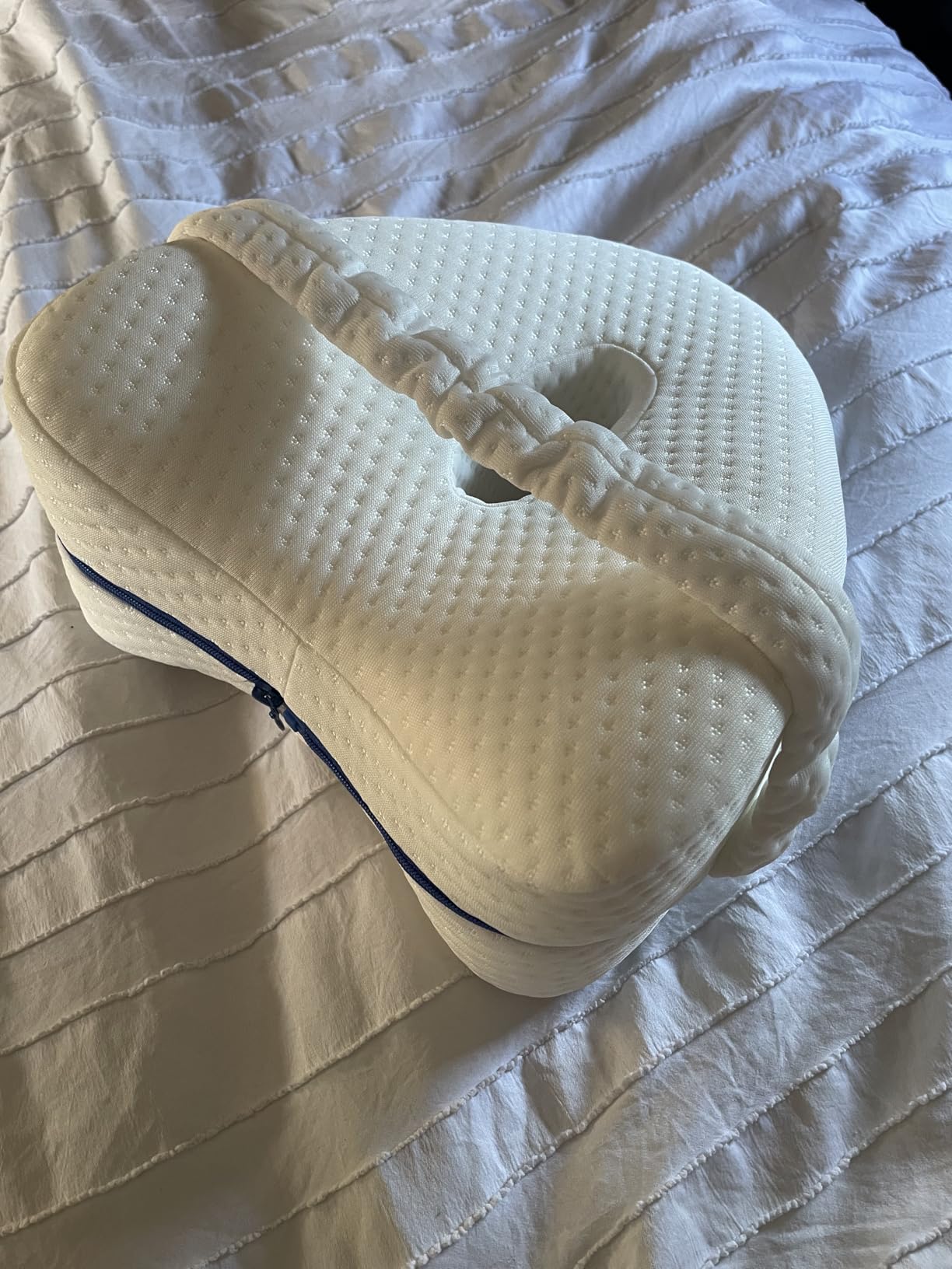 I’m 56 and have rods and screws in my lower back from a 2015 surgery. I mostly sleep on my left side with my knees bent. For years I used a little travel pillow to keep my knees from pressing together, but regular pillows were too big, too soft, and honestly didn’t help—this year the right-hip pain and sciatica started up anyway.I saw a commercial mentioning a foam pillow between the knees and decided to try this one. The shape and firmness felt right away like it was made for side sleeping—no bulk, no slipping. The first night shocked me: my hip pain vanished instantly and I didn’t need ibuprofen. I slept straight through and finally woke up comfortable.